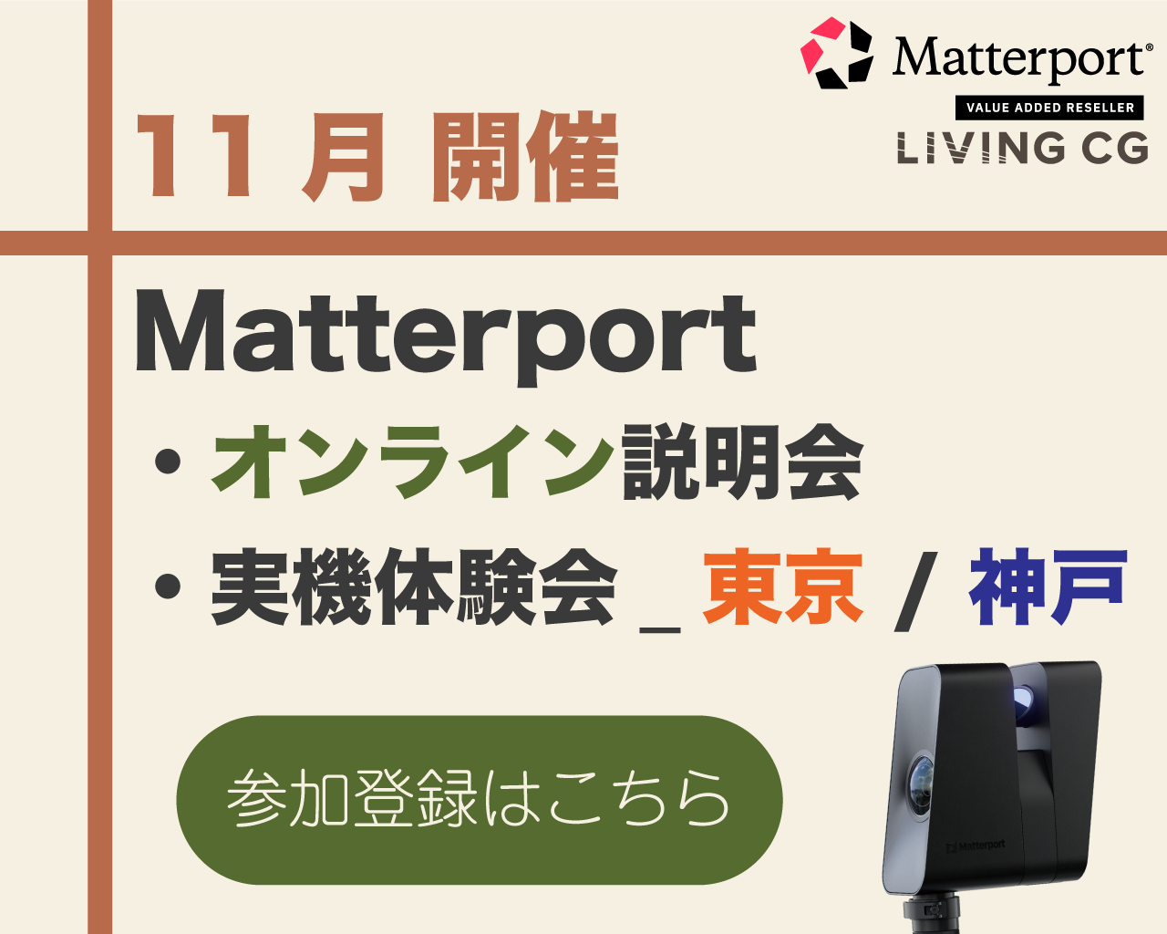Matterport(マーターポート)を使えば、誰でも簡単に、正確で没入感のある3Dがつくれます。どんな空間でも撮影をするだけで、自動合成された3Dモデルが生成され、空間を立体・平面で捉えることが出来ます。